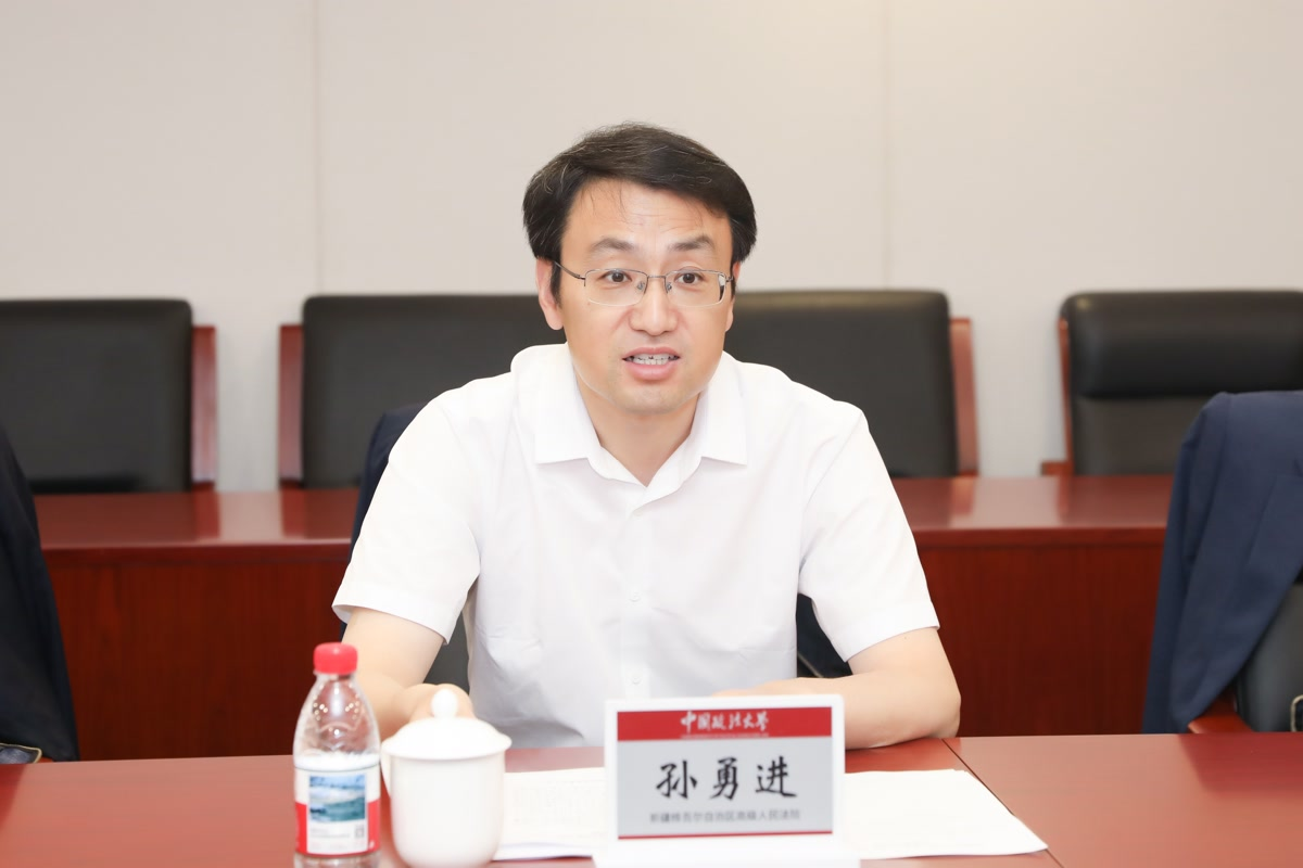 孙勇进代表新疆法院系统对中国政法大学长期以来的关心与支持表示衷心的感谢。他从发展历程、案件受理、审判体系、人才培养等方面介绍了新疆高院的基本建设情况;他希望,双方在法官培训、学术交流、案件咨询、涉外法治、挂职交流、毕业生招录、实习实践基地建设等方面进一步深化,共同探索人才培养与实务合作创新机,为法治新疆建设和丝绸之路经济带核心区发展提供坚实人才支撑与智力保障。